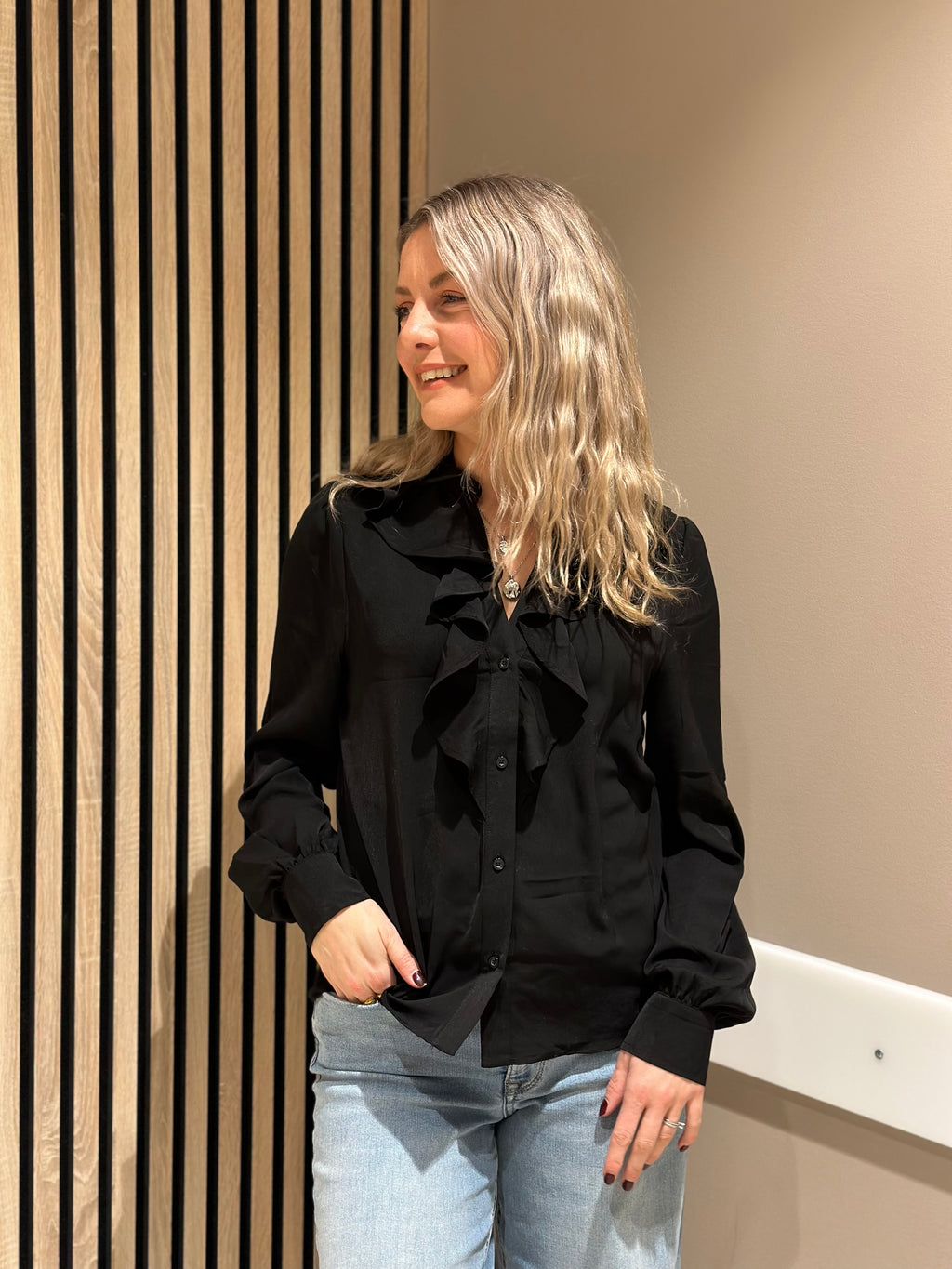 ONLY - THALIA LIFE LS V-NECK FRILL TOP - BLACK