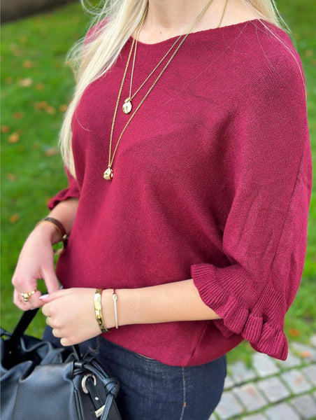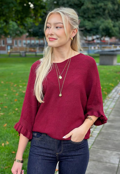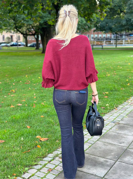 En perfekt stickad tröja som kan stylas på många olika sätt. Man kan ha den över en klänning, ha en skjorta undertill eller kanske ett linne. Sen kan man också ha den som den är. Har en liten volangkant på ärmslutet. Kommer i flera färger.