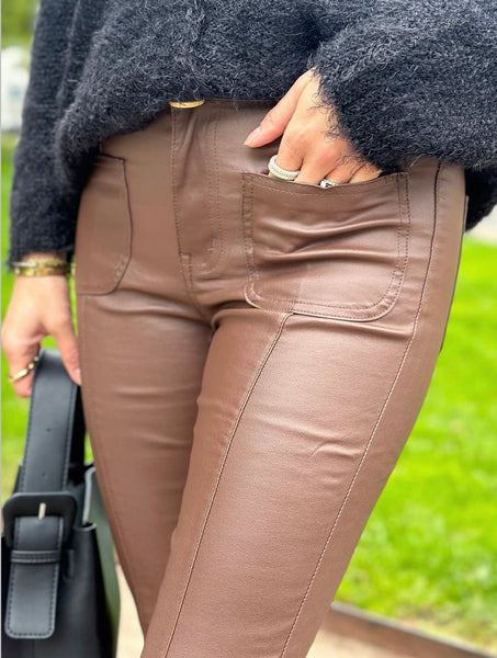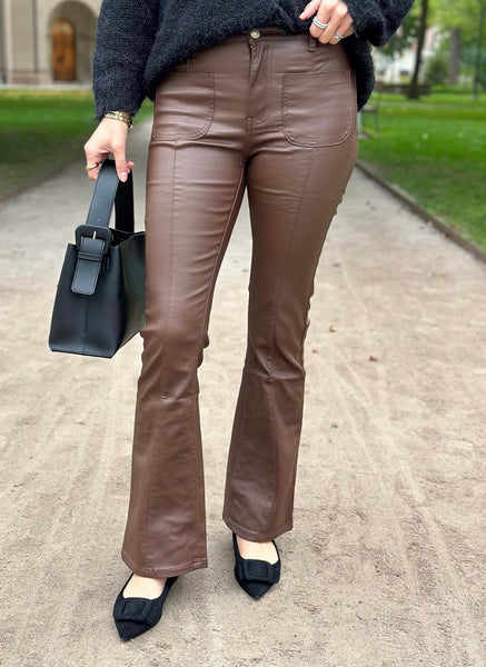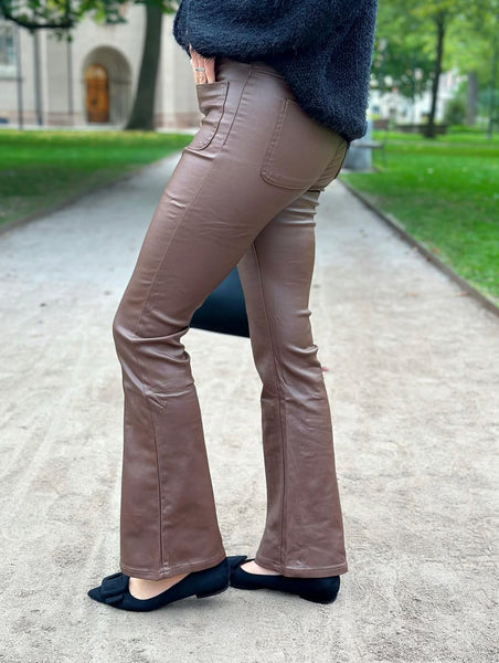Byxor i en fantastisk brun färg. Är i en skinnimitation och har en bootcut nedtill. Små fickor framtill. Normal i storlek. Paulin bär storlek 36 och är 167cm lång.