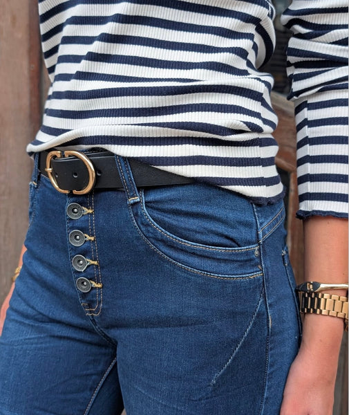 Mjuka byxor/jeans från cosyhouse. Högre midja/mid-waist. Knappar framtill. Fickor både i fram och bak. Mycket stretch. Amanda bär storlek XS och är 178cm lång.