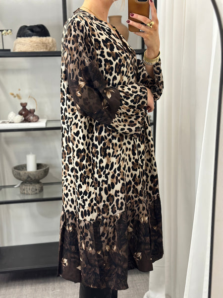 En så fin leopard mönstrig klänning. Har en vidare ärm och en V-ringning framtill.