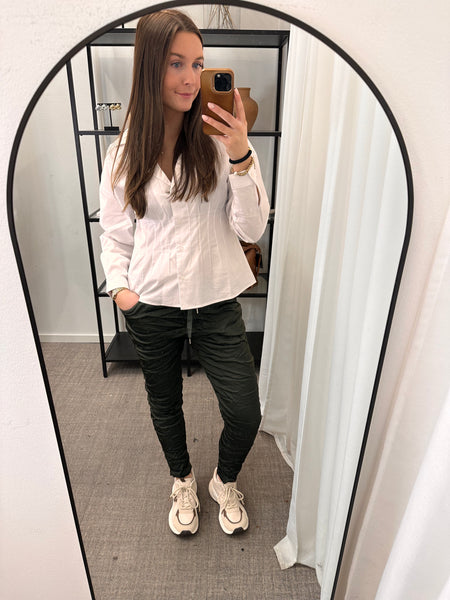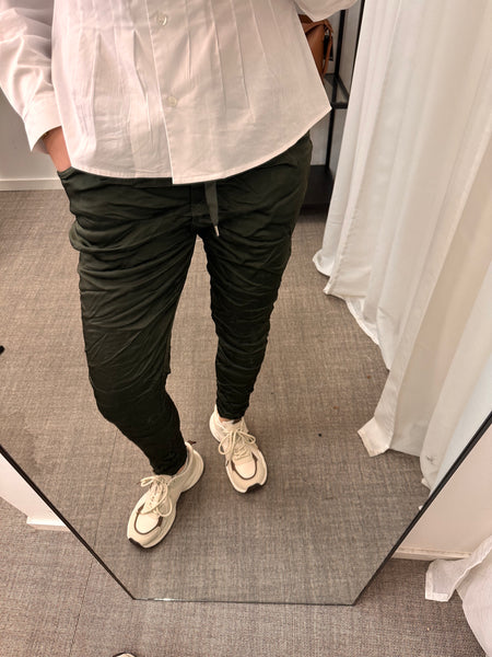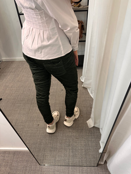 Supersköna cargobyxor från Gemini. Stretchigt material och knyte i midjan. Fickor i fram. Är i ett glansigt material. Lite tajtare i modellen. Julia är en storlek S.