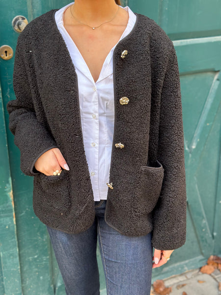 En så snygg teddy jacka ifrån Gemini. Är lite tunnare så kan även användas inomhus. Har detaljerade guldknappar framtill och två fickor.