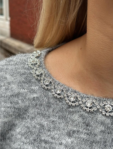 En så himla fin stickad tröja ifrån JDY. Piffa upp din vardags outfit med lite diamanter. En simpel modell på tröjan men med en hals av diamanter. Till denna stickade tröja behövs inget halsband för att smycka upp den. Normal i storlek. Sara bär storlek S.