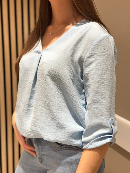 Härlig bastopp med v-ringning från JDY. Lös passform och 3/4 ärm. Normal i storleken. Julia bär storlek 36.