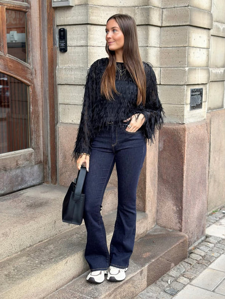 En magisk blus med fransar. Piffa upp din outfit med denna. Lite transparent så kan bäras med ett linne undertill. Normal i storlek. Julia bär storlek S.