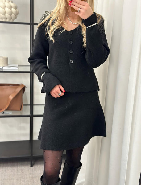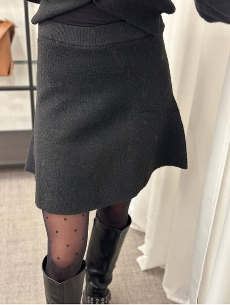 En superfin kortkjol som har en matchande cardigan till. I ett mjukt och tjockt stickat material. Har ett tjockt resårband upptill och har en mer konformad modell. Normal i storlek. Ella bär storlek XS.