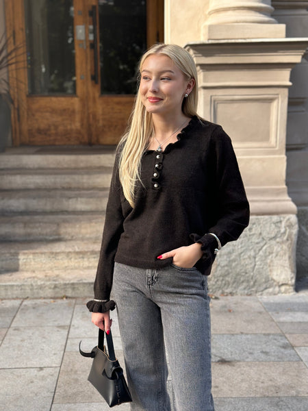 En helt underbar stickad Pullover med massor av detaljer. V-ringning med en volangkant som förhöjer hela vägen runt kragen. Finns även en volangkant vid ärmkanten. Pärlknappar längst mitten som en fin detalj. Går knyte att knäppa upp. Normal i storlek. Ella bär storlek S.