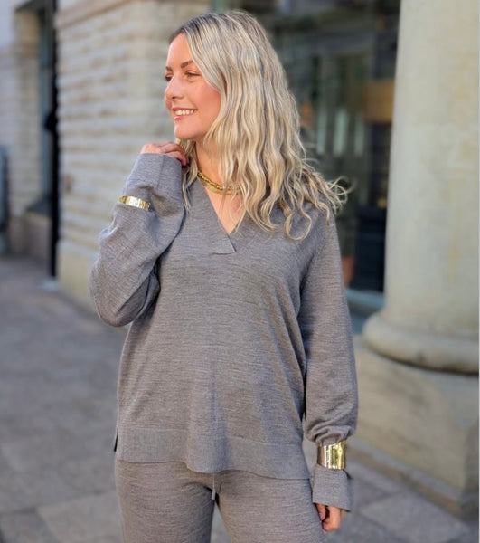 Kolla in detta underbara mjukis-sättet från LEVETÉ ROOM. Mjukt och härligt material som betsår av 100% Ull. Med en liten krage samt v-ringning framtill som ger plagget en liten detalj och lyxkänsla. Perfekt att ha nu när det börjar bli kallare. Finns både tröja samt byxor. Normal i storlek. Paulin bär storlek M i tröjan.