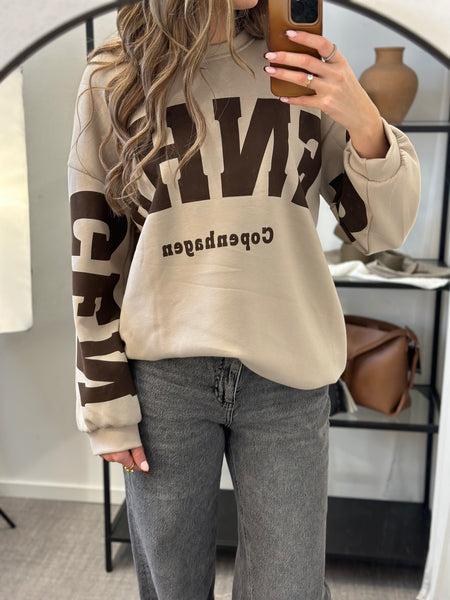 Denna magiska tröja är så mjuk och skön i materialet. Är i en beige färg med brunt tryck framtill. Står med text "COPENHAGEN" framtill. Är vidare i modellen. Sanna bär storlek S/M.