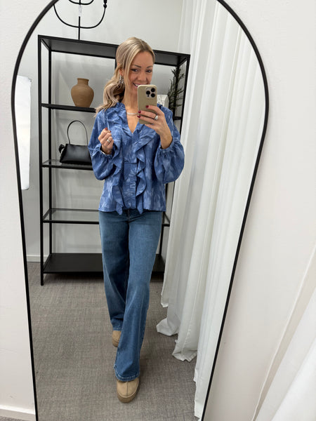 En så fin blomblus ifrån Marta. Har en V-ringning framtill med en volang kant. Rak i modellen. Normal i storleken. Sanna bär storlek S/M.
