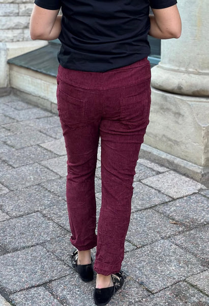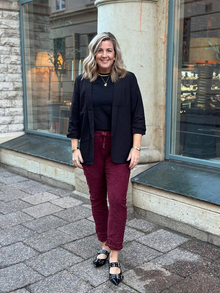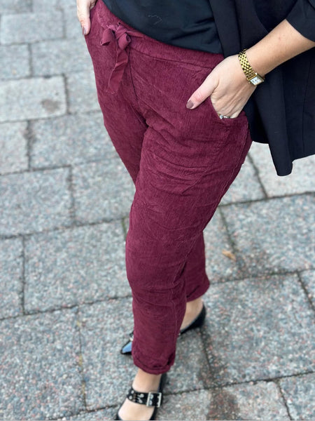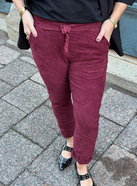 Så snygga manchester byxor I en så fin vinröd färg. Har ett snöre runt midjan. Och lite tajtare i modellen. Normala i storleken. Anna bär storlek L/XL.