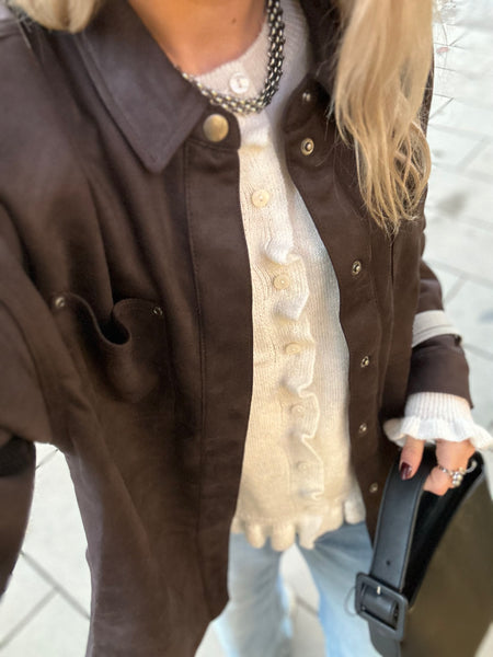 En så snygg mockaimiterad jacka ifrån Only. Har två stora fickor på framsidan av jackan och en dold knapprad framtill. Är lite tunnare i modellen så går jättebra att även bära inomhus. Normal i storleken. Paulin bär storlek S.