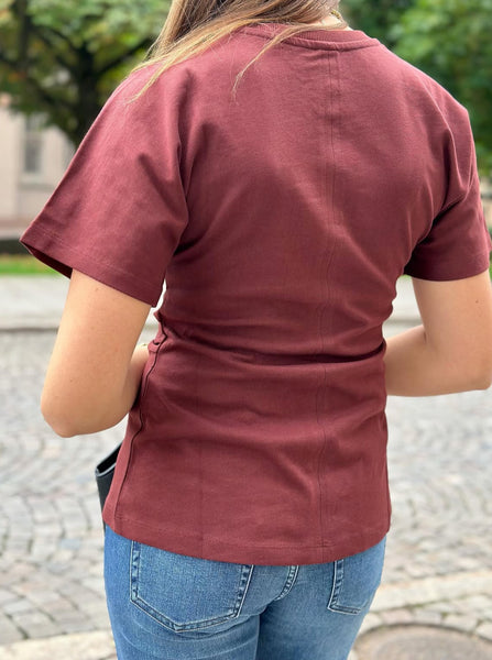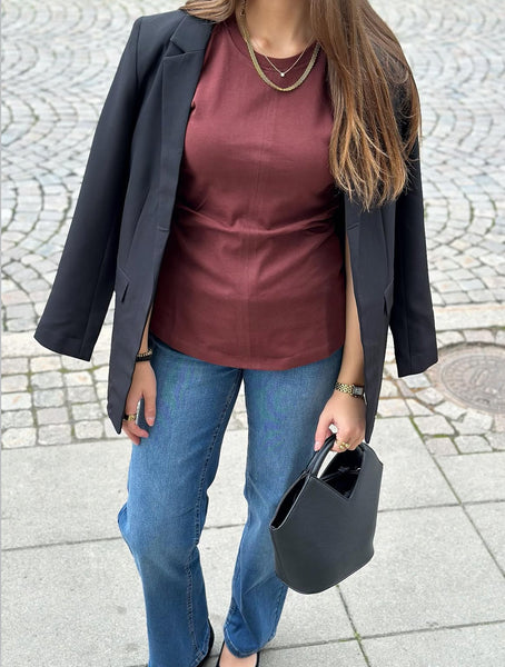En superhärlig topp med drapering i midjan och kortare ärm. Perfekt basplagg som både kan stylas upp och ned. Normal i storlek. Julia bär storlek S.