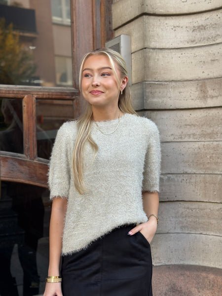 En så snygg stickad tröja ifrån pieces. Har en kortare ärm och glittertrådar. Mjuk och skön och livlar upp din look. Lite längre i modellen. Normal i storlek. Ella bär storlek S.