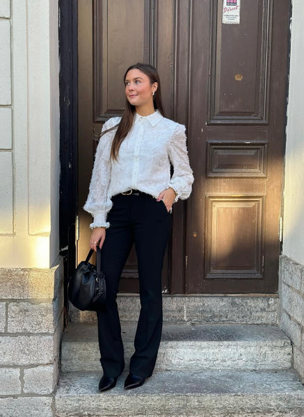 En så fin skjortblus ifrån Pieces. I ett mjukt och luftigt material. Har en smockärmskant som ger en lite ballongärm. Skjortkrage upptill och i ett magiskt blommotiv. Normal i storlek. Julia bär storlek S.