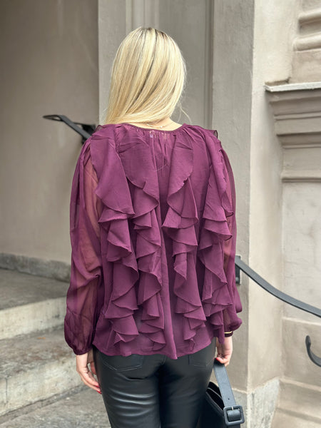 En magisk blus i ett tunt material som är lite genomskinligt. Med flera volangränder runt om på blusen som ger en extra detalj. Har en öppning framtill med en knapp. Normal i storleken. Ella bär storlek XS.