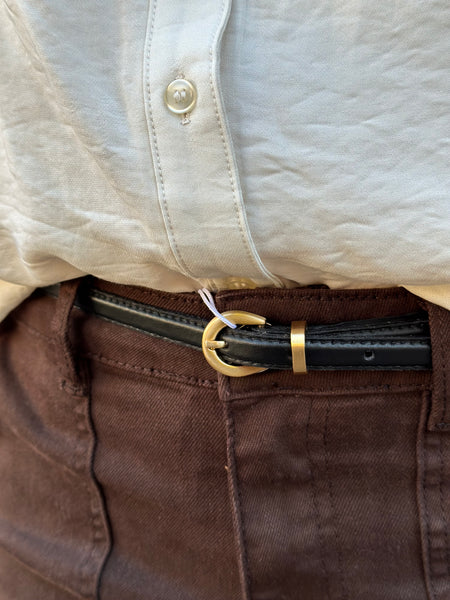Svart bälte med matt guldspänne från VERO MODA. 39% läderfibrer, 31% polyester och 30% zink.