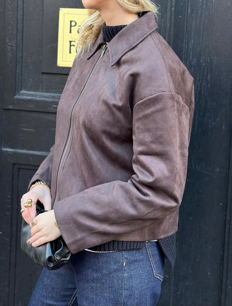 En så fin mockaimitations jacka i en kortare modell. Har en dragkedja framtill. Är lite tunnare materialet. Normal i storleken. Alice bär storlek 36.