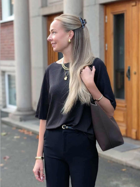 Glitter top! En helt magisk top med 2/4 ärmar. Toppen är i en mörkbrun färg med brun koppar trådar som gör att den glimmrar. En rakare U-ringning upptill. Normal i storleken. Amanda bär storlek XS.